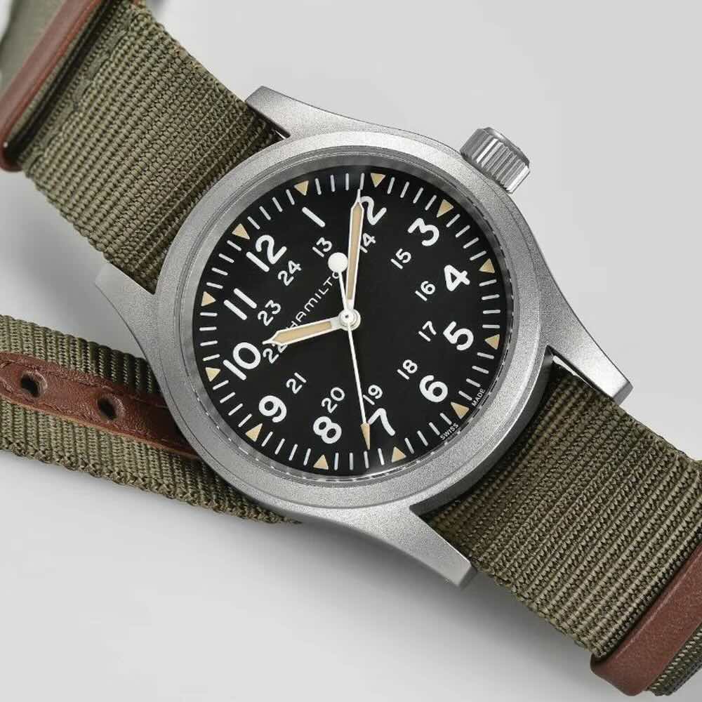 This Khaki Field variant features a Hamilton-exclusive ETA H-23 manual-wind movement, which boasts a Nivachron balance spring and a class-leading 80-hour power reserve, all while keeping the case height under 12mm. With the inclusion of the on-dial "gas gauge," a very useful perk in a hand-winding watch, this is the field watch for those that have fallen hard for all things horological, as winding the movement becomes a personal ritual you’ll look forward to. The availability of a matching matte-finished bracelet just adds to the versatility, but a nylon fabric and leather strap is on the menu for traditionalists. To sum up, the Mechanical Power Reserve is a love letter to collectors, a daily reminder of why we love the hobby.