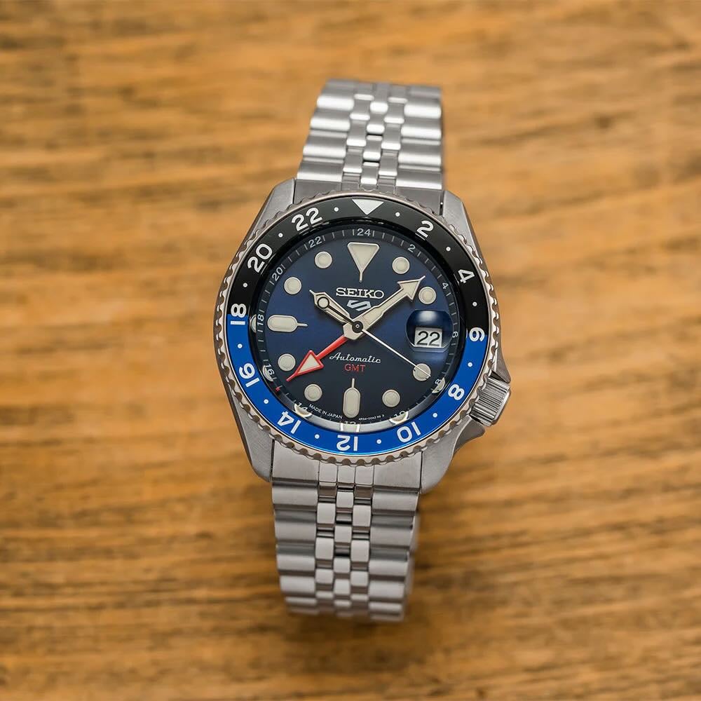 The hue of the dial is quite a deep, dark shade of blue, but with that sunray finish, you’ll get that nice flash of shine as the light hits the surface. There’s also some bold, punchy pops of orange mixed in throughout, but I would say these flashes don’t feel overwhelming for those who are a bit color shy, and feel balanced with the more classic stylings of the lume-filled applied indices (which vary from pips to rhombus-shaped markers), as well as the laid-back blue bezel around the dial. And about that bezel – while you might have been expecting a unidirectional dive bezel, this Islander has gone for the unexpected with a bi-directional GMT bezel with a 24-hour scale. So, when you get down to the nitty-gritty, both of the watches at hand today are really two different takes on GMT divers.