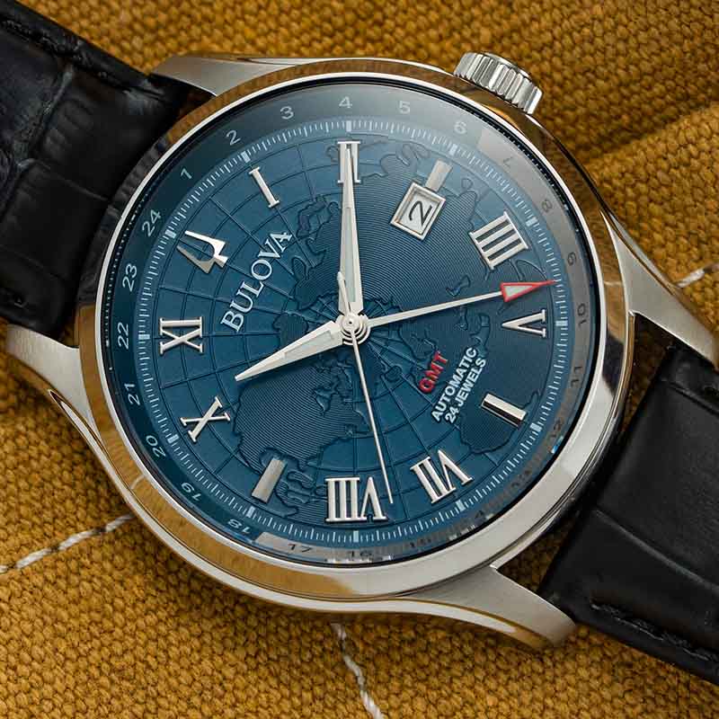 Bearing a combination of airport codes and city abbreviations, the city ring that borders the dial’s outer edge, used in concert with the numbered chapter ring just within its circle, enables easy viewing of the current time in any of the world’s 24 major time zones. Pressing the push-button advances both the ring and the hour hand for a very user-friendly quick change of the local time; the hand will jump to the proper hour indicated by the city indicated above 12 o’clock while the minute hand will remain stationary.