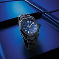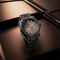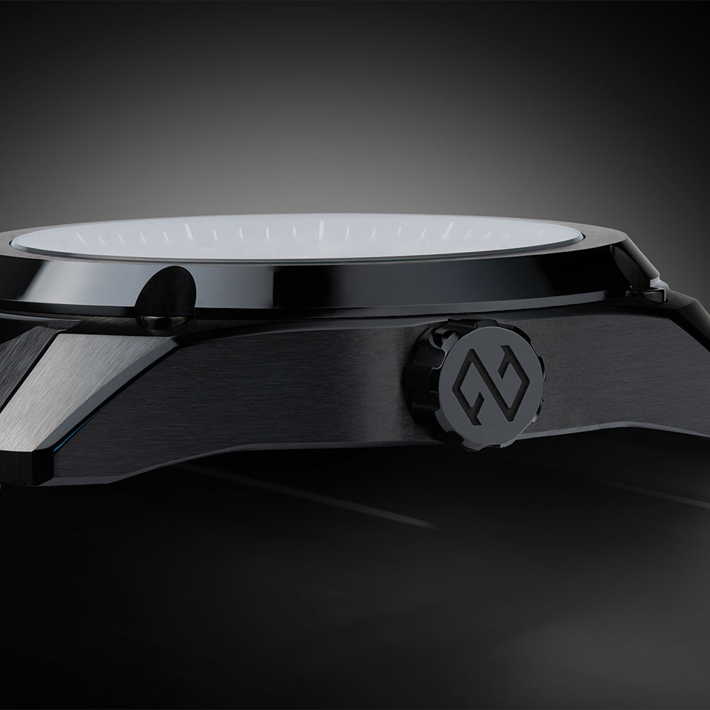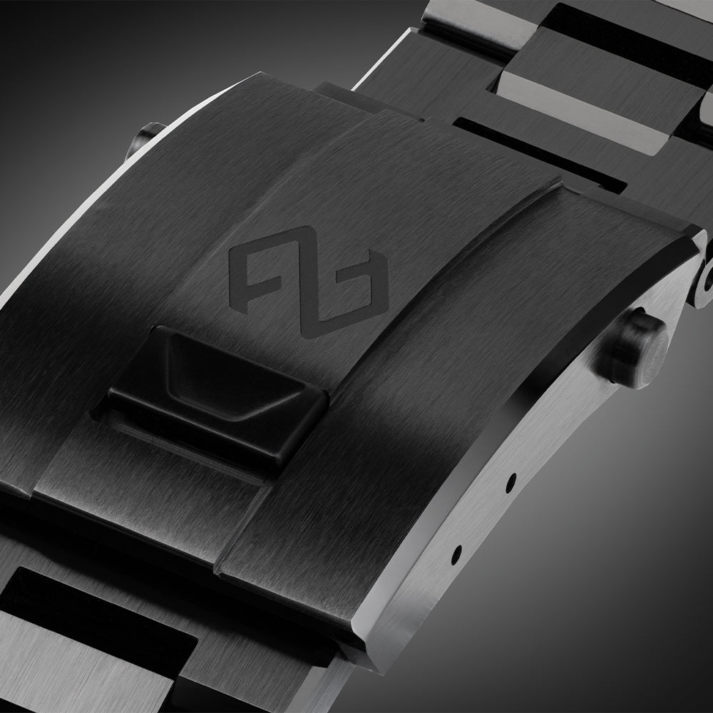 Razor-sharp, CNC-milled horizontal lines with vertical brushing, applied multi-faceted indices, brushed and mirror-polished bevels, and a beveled 6-o’clock date with a tone-on-tone disk for a clean read from off-axis