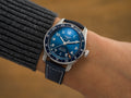 Bidirectional rotating bezel with blue ceramic insert, engraved 24-hour scale with lacquered numbers and Super-LumiNova® triangle
